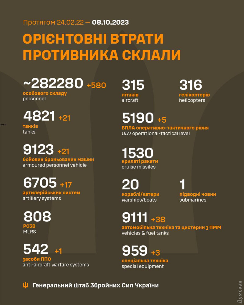 580 російських загарбників полягли в Україні 7 жовтня. Загальні втрати окупантів від початку повномасштабного вторгнення — 282 тисячі 280 солдатів і офіцерів.