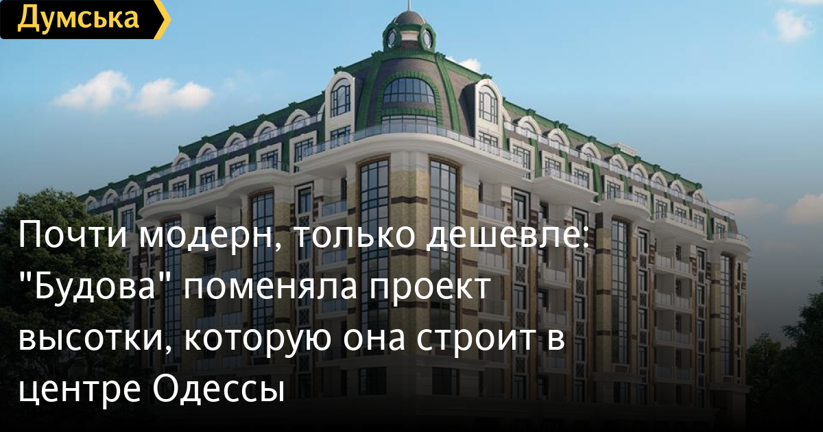 Если раньше фирма собиралась возвести здание без особых изысков и декора, то теперь на рендерах изображен восьмиэтажный дом (два этажа мансардных), стилизованный под модерн, с угловой башенкой и серо-зеленой крышей. На эскизе это не отражено, но судя по детальному плану территории, новый жилкомплекс будет семисекционным.