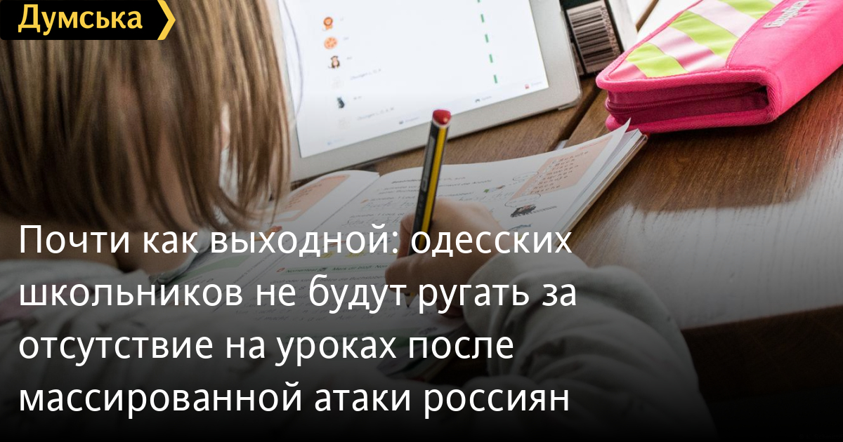 Майже як вихідний: одеських школярів не сваритимуть за відсутність на уроках після масованої атаки росіянОдеські школярі, які навчаються очно або дистанційно, можуть пропустити заняття 9 березня. Як повідомила директорка міського департаменту освіти Олена Буйневич, сварити за це дитину не будуть. «Якщо не спали ніч, зважайте на стан і прийміть рішення, йти до школи чи підключати до занять. У закладах освіти працюватимуть над повторенням. Тривога триває. Пам'ятаємо, що переміщення вулицями є небезпечним. Тому якщо дитина очно відвідує школу чи садочок, краще, за можливості, залишити її вдома», — написала Буйневич. Чиновниця додала, що укриття в навчальних закладах відкриті. СМЕРТЬ РОСІЙСЬКИМ ОКУПАНТАМ! Помітили помилку? Виділяйте слова з помилкою та натискайте control-enter |