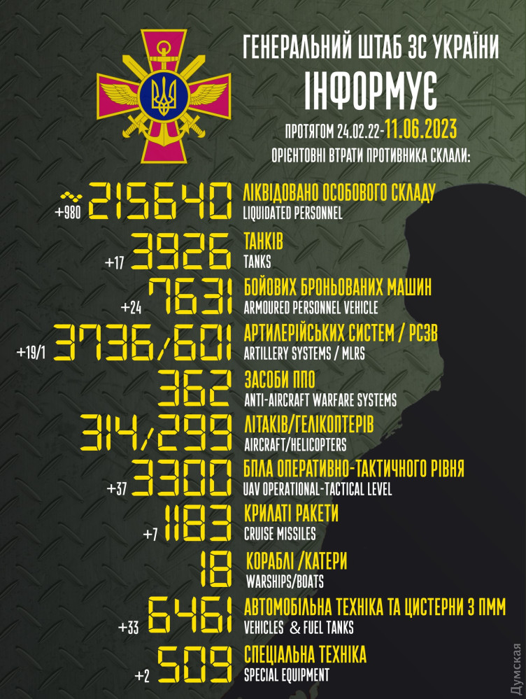 Майже тисячу окупантів і 37 дронів знищено в Україні за добуСили оборони України 10 червня ліквідували 980 російських загарбників. Від початку повномасштабного вторгнення втрати противника становлять уже 215 тисяч 640 солдатів і офіцерів. За даними Генштабу Збройних сил України, також учора було знищено 17 ворожих танків (3926 за весь час), 24 бойові броньовані машини (7631), 33 вантажівки та автоцистерни (6461), дві одиниці спецтехніки (509). Також спалено 19 артилерійських систем (3736), одну реактивну систему залпового вогню (601). Збито 37 дронів оперативно-тактичного рівня (3300), сім крилатих ракет (1183). СМЕРТЬ РОСІЙСЬКИМ ОКУПАНТАМ! Помітили помилку? Виділяйте слова з помилкою та натискайте control-enter |