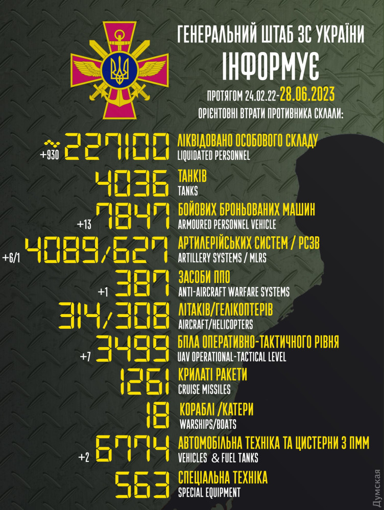 930 російських солдатів і офіцерів було знищено в Україні 27 червня. Загальні втрати загарбників уже становлять 227 тисяч 100 військовослужбовців.