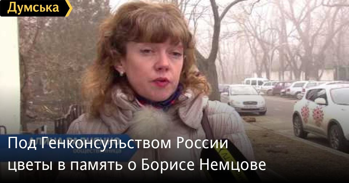 Цветы и фотографии в память о Борисе Немцове у Генерального консульства России в Одессе
