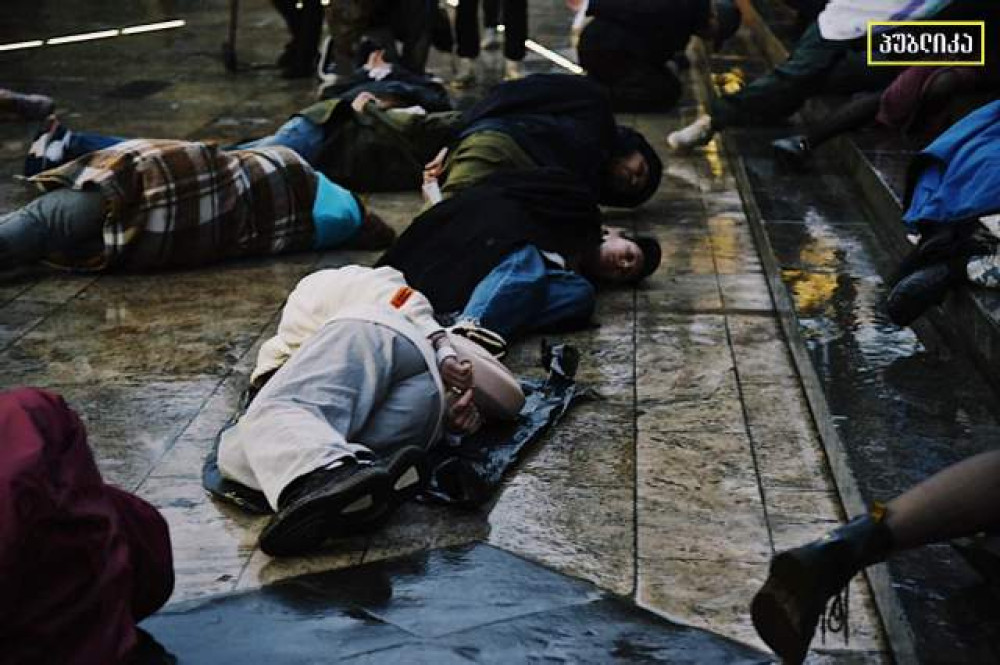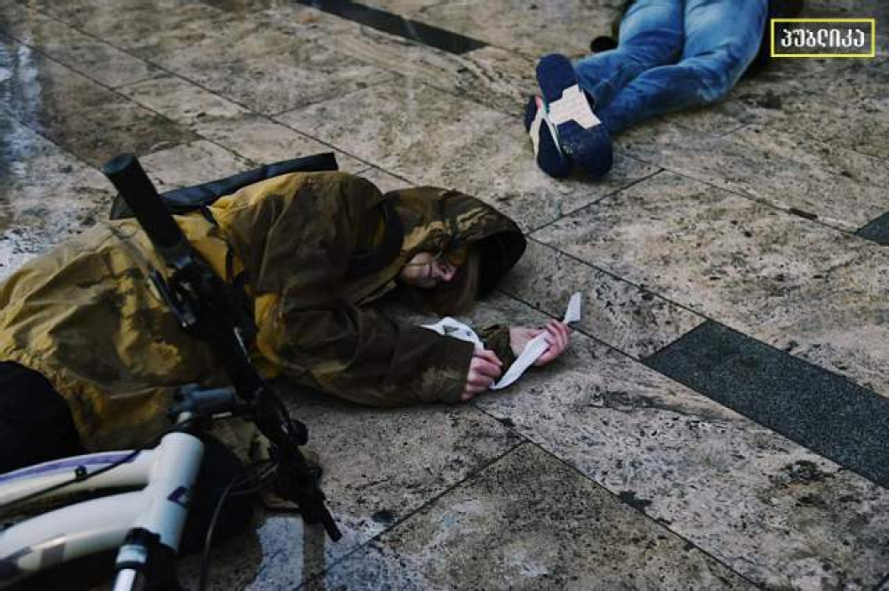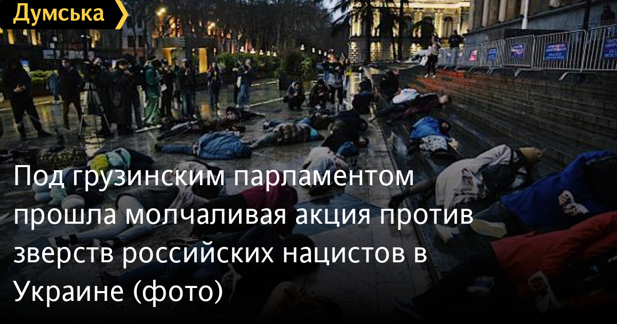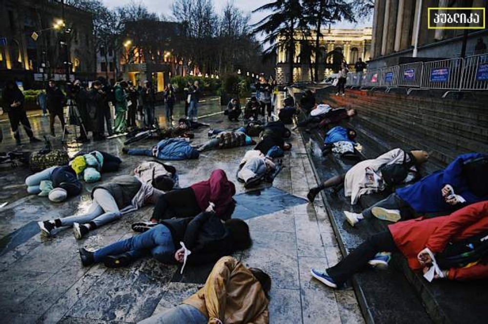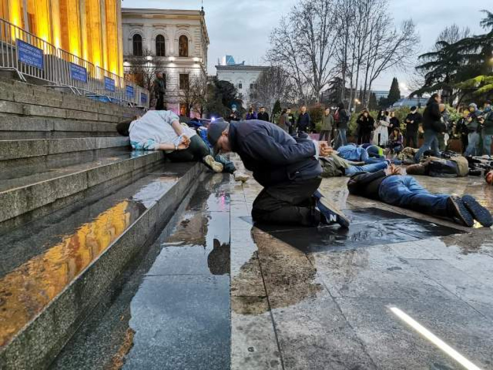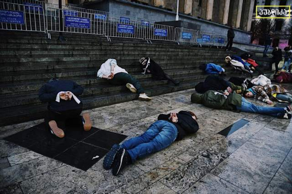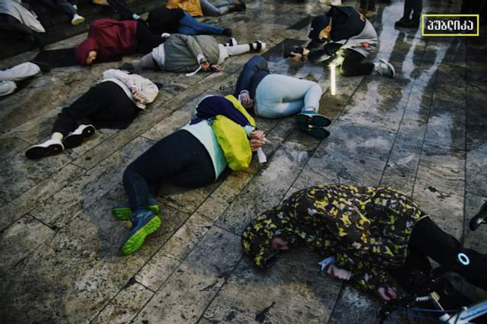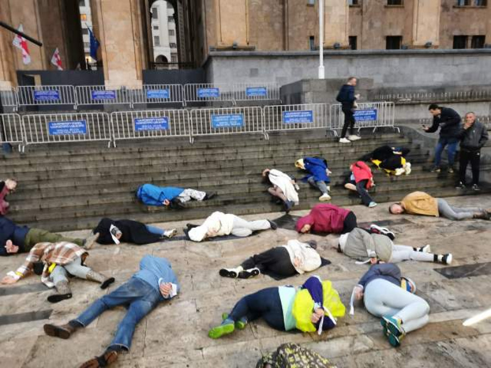 Десятки активистов провели акцию под стенами грузинского парламента в Тбилиси. Люди легли на землю со связанными руками, чтобы выразить свой молчаливый протест против зверств, которые творят российские оккупанты в захваченных украинских городах.