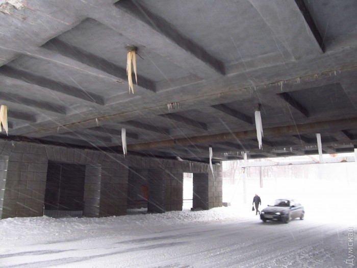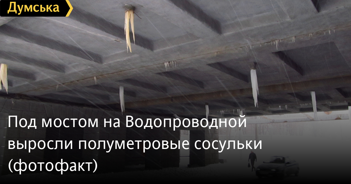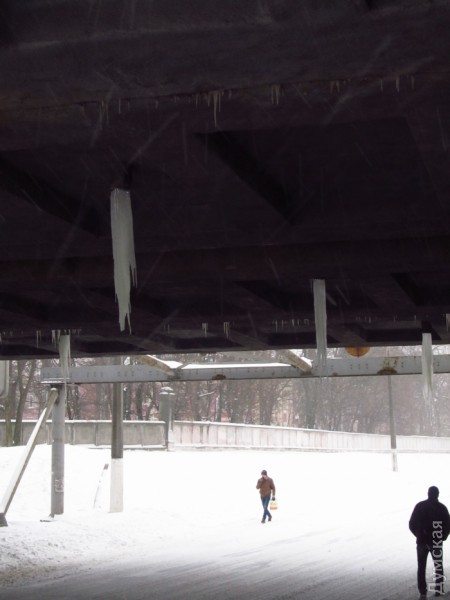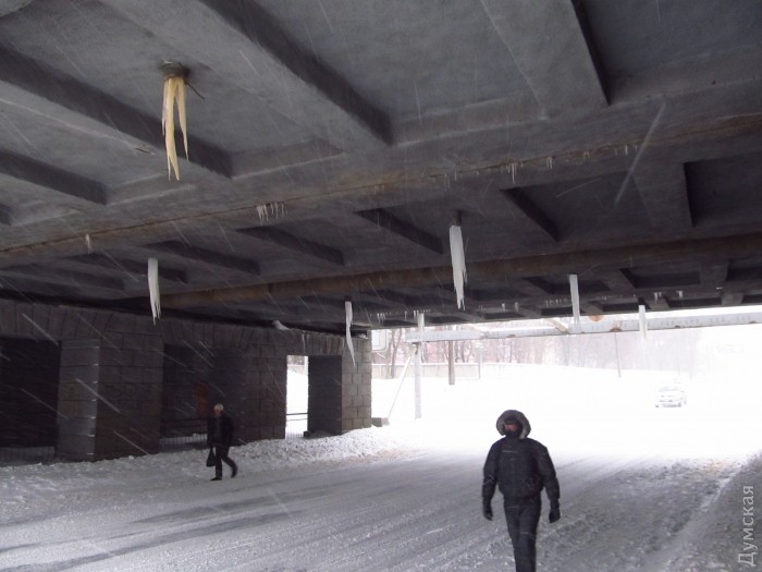 Полуметровые сосульки угрожают пешеходам и автомобилям под железнодорожным мостом на Водопроводной.