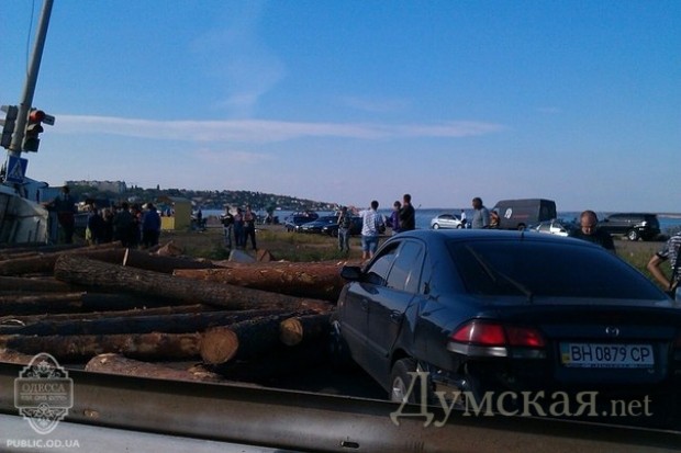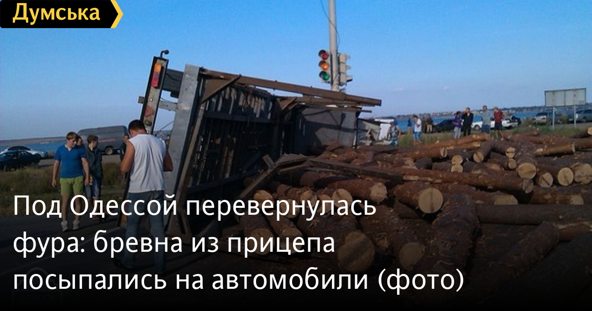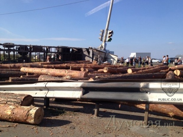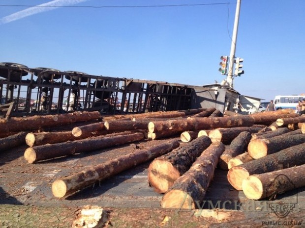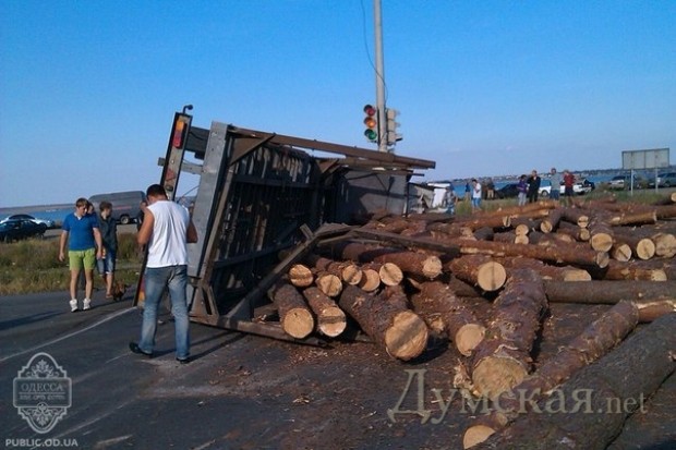 Фура, груженная бревнами, перевернулась под Одессой в воскресенье.