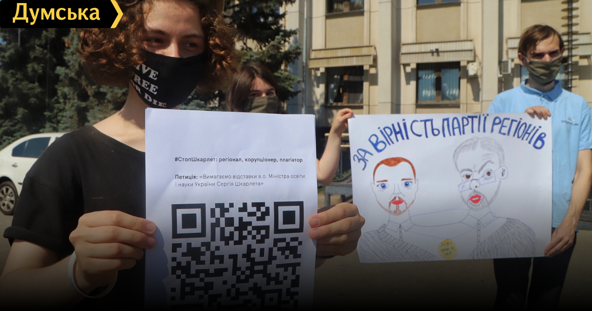 Участники акции, преимущественно студенты, держали в руках плакаты и раздавали прохожим листовки с QR-кодом на петицию об отставке Шкарлета.