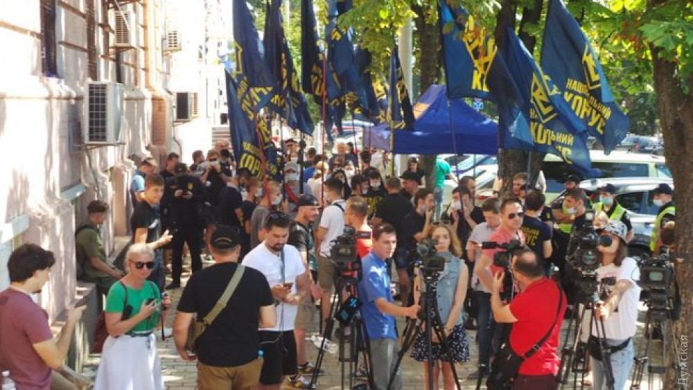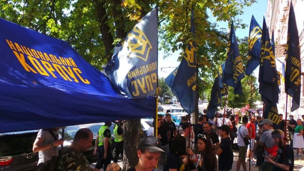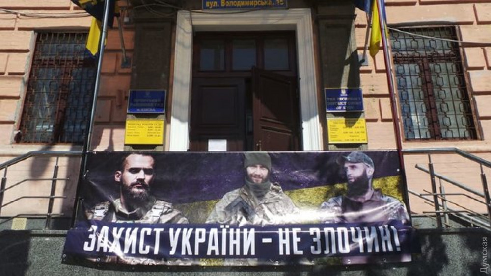 Около полусотни представителей Нацкорпуса собрались возле Печерского райсуда, чтобы поддержать ветеранов АТО Сергея Тамарина, Александра Волкова и Юрия Каплю.