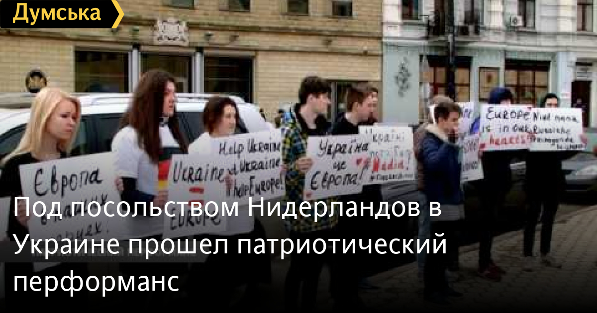 «Вырвем Украину из лап Путина»! Акция под таким названием прошла под посольством Нидерландов в Украине. Перфоманс посвящен всенародному референдуму в Голландии, который пройдет 6 апреля. Цель мероприятия – продемонстрировать голландцам, что наша страна – поле битвы между демократией и диктатурой, свободой и неволей. СМЕРТЬ РОССИЙСКИМ ОККУПАНТАМ! Заметили ошибку? Выделяйте слова с ошибкой и нажимайте control-enter Думская ТВ. Сюжеты: