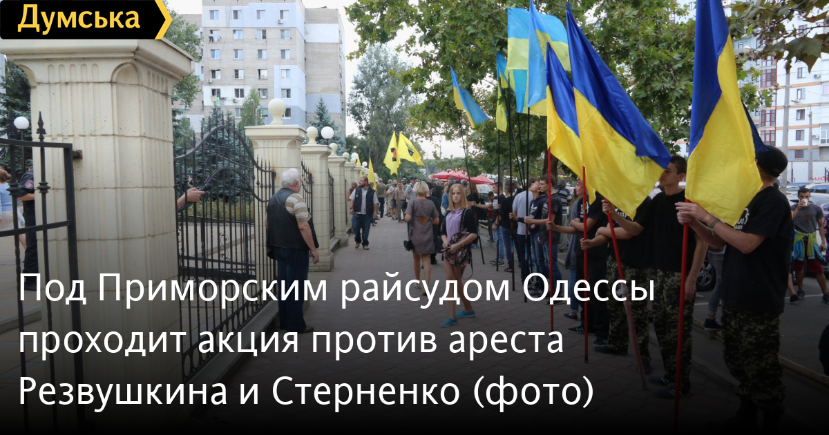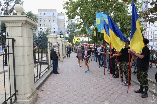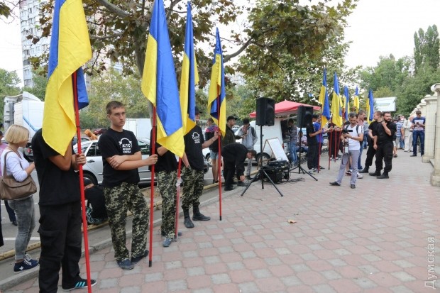 У Приморского райсуда Одессы проходит акция протеста патриотических организаций, которым не нравятся действия правоохранителей в отношении лидеров «Правого сектора» и Антимайдана Сергея Стерненко и Евгения Резвушкина.