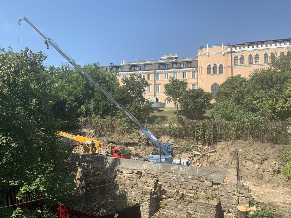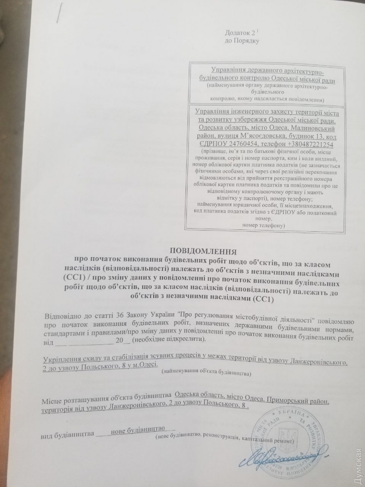 Строители говорят, что занимаются укреплением склона и стабилизацией оползневых процессов. Площадь застройки — 1006 кв. м. Заказчиком работ выступает управление инженерной защиты территории города и развития побережья Одесского горсовета. Генподрядчиком является фирма «Стимакс», а проектную документацию разработало ООО «Укрстрой сервис». Такие данные приведены на информационном стенде, размещенном возле стройплощадки.