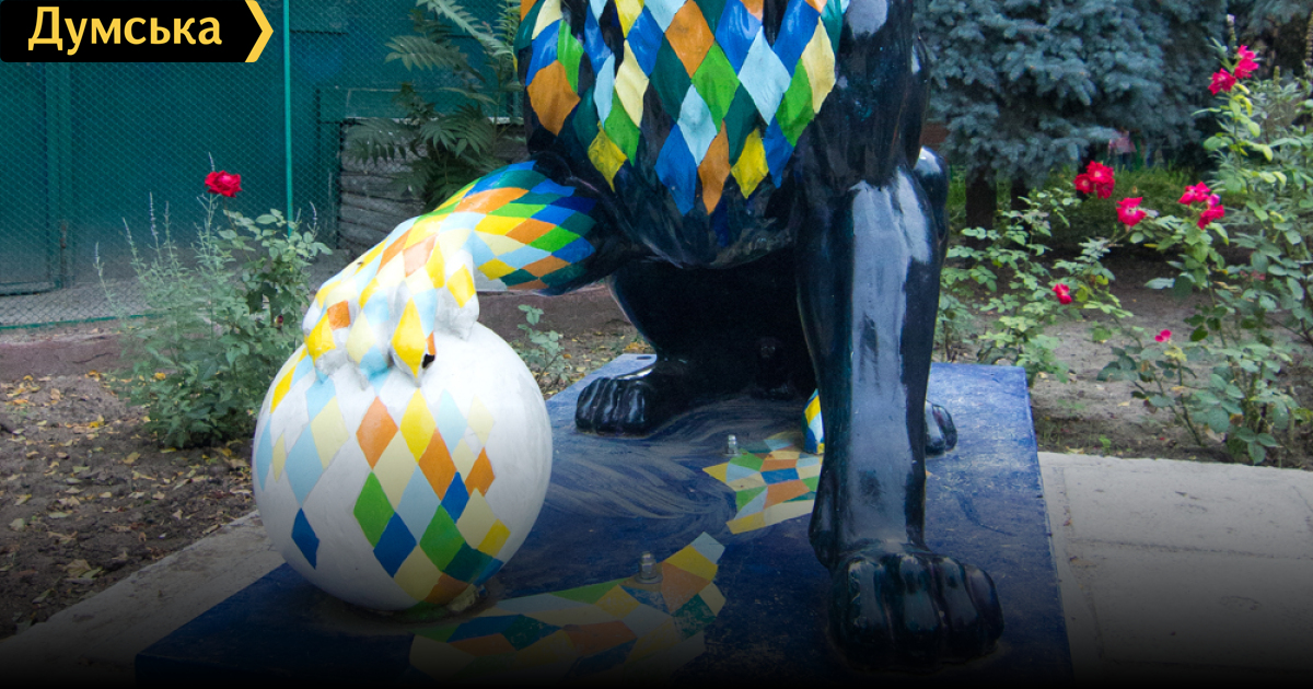 Выглядит так, как будто обычную скульптуру льва разрисовали какие-то хулиганы…
