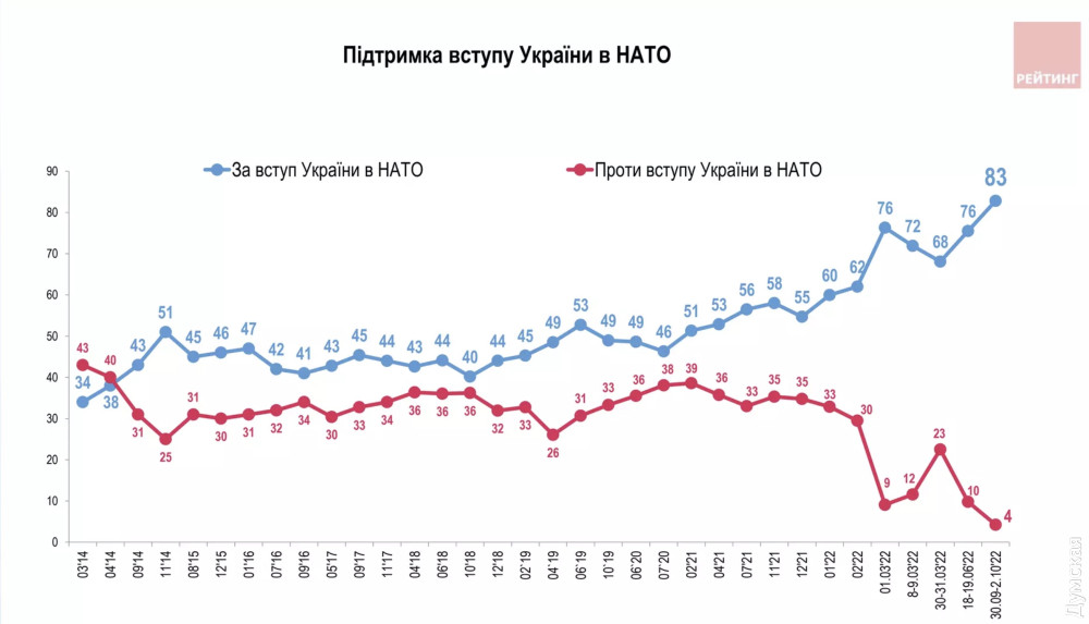 Соціологічне дослідження, проведене групою «Рейтинг», показало, що зараз інтеграцію до Північноатлантичного Альянсу підтримують 83% українців.
