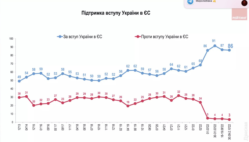 Залишається високою підтримка українців до вступу до ЄС. Зараз вона на рівні 83%, але впала порівняно з березневими показниками – тоді був максимум 91% підтримки респондентів.