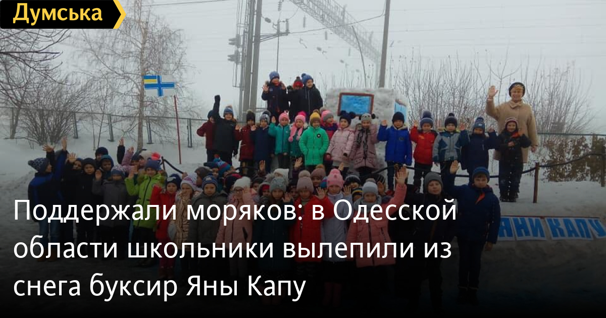 Акцию в поддержку захваченных украинских моряков провели ученики школы в селе Белено Балтского района. Дети соорудили из снега буксир «Яны Капу».