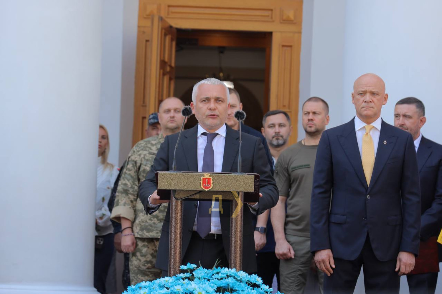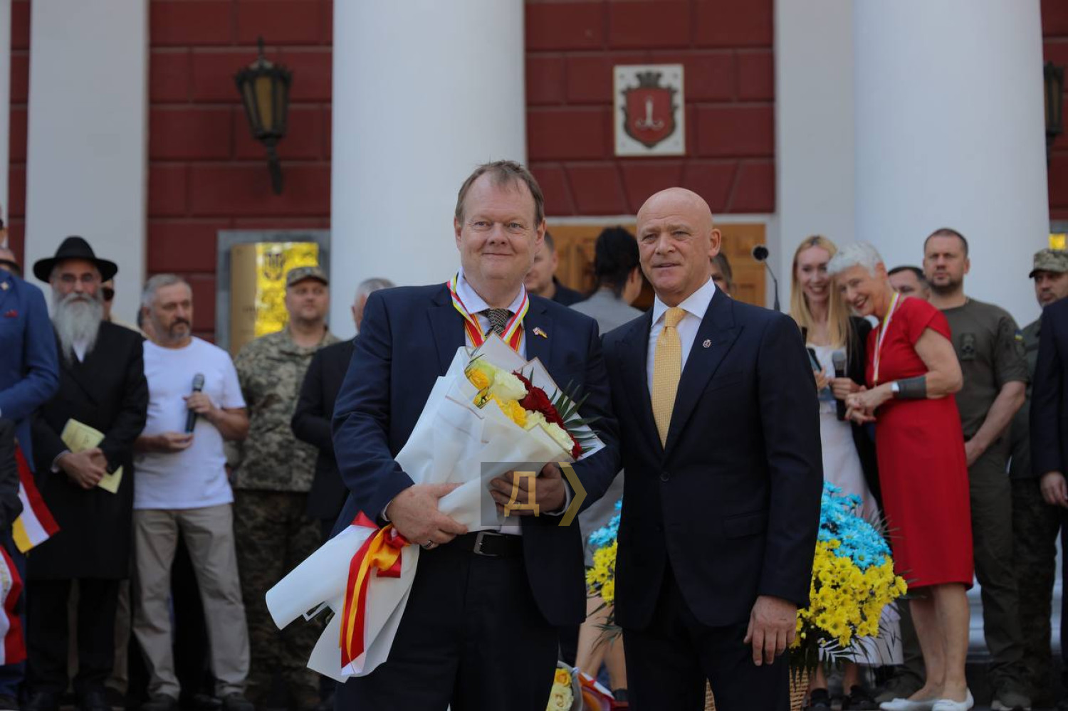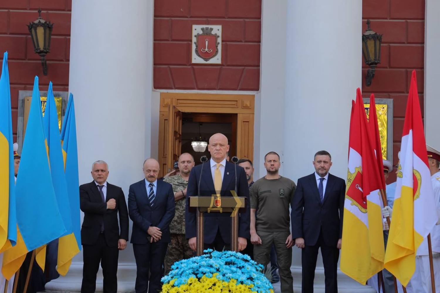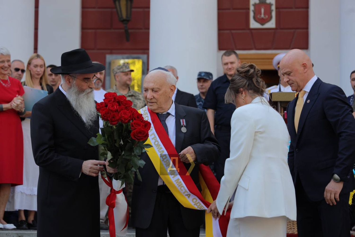 Мер Геннадій Труханов привітав усіх з Днем народження міста і зазначив, що Одеса стала символом стійкості, гідності та взаємної підтримки. «Одеса — це не тільки архітектура і море, це ті, хто не втрачає людяності під ракетами, допомагає сусідам, захищає країну, рятує дітей, ремонтує школи, готує їжу для військових і просто не здається. Ми вшановуємо пам'ять тих, кого втратили, дякуємо тим, хто захищає нас на фронті і в тилу. Одеса буде жити, і буде ще сильнішою і красивішою. З Днем міста рідна Одеса», — зазначив Геннадій Труханов. Він розповів, що місто отримує не тільки привітання, а й подарунки від міст-побратимів. «Сьогодні до нас приїхав Пол Гоггін з Брістоля, який привіз нам пожежні машини. Ще три машини нам подарувало наше місто-партнер Майнц. Дуже приємно, що ми отримали такі необхідні подарунки, які допомагатимуть рятувати життя людей, — підкреслив мер. Голова Одеської ОВА Олег Кіпер додав, що Одеса завжди мала унікальний колорит та історію. «Велика українська письменниця Леся Українка написала, що найбільша краса Одеси, її головна гордість – це море. А я думаю, ми можемо собі дозволити не погодитися, оскільки море вражає своєю величчю. Але справжня краса нашого міста – це наші люди, наші одесити, українці. Саме ви створюєте особливий характер Одеси. Щирі, відважні, з почуттям гумору навіть у найважчі часи. Завдяки одеситам місто живе і тримається. Одеса живе і бореться, тому що кожен на своєму місці робить неймовірне. Я хочу висловити найщирішу подяку нашим воїнам. Саме вони захищають наше місто від російського терору, дають нам можливість збиратися тут і вільно говорити про майбутнє», — заявив Олег Кіпер. Він також подякував лікарям і медпрацівникам, які щодня рятують життя в госпіталях, лікарнях і на передовій, і рятувальникам, які завжди першими приходять на допомогу під час обстрілів, пожеж або будь-яких інших викликів. Під час святкування знак «Почесний громадянин міста Одеси» вручили голові регіональної асоціації євреїв — колишніх в'язнів гетто і нацистських концтаборів Рувіну (Роману) Шварцману. Також почесну нагороду Одеського міського голови «ОДЕССА» отримала директор з питань Східної та Центральної Європи Центру ліберальної сучасності Марілуїзе Бек і депутат міської ради, екс-лорд міста Брістоль Пол Гоггін. А почесну нагороду імені Григорія Григоровича Маразлі II ступеня вручили голові наглядової ради ТОВ «Стікон», Почесному громадянину Одеси Леоніду Крючкову. На виставці «Алея Незламних міст», що розташована на Біржовій площі і присвячена пам'яті жертв війни, сьогодні відкрили колону, присвячену Миколаєву. Також відбулося відкриття трьох нових табличок міст-побратимів Одеси — Майнц, Гейдельберг (Німеччина) та округ Таїта-Тавета (Кенія).