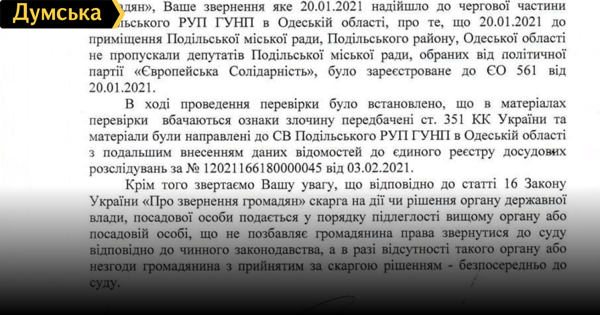 Подольская полиция выполнила решение суда и открыла уголовное производство по факту недопуска депутатов в горсовет (документ)Подольский отдел полиции Одесской области выполнил решение Киевского районного суда Одессы и открыл уголовное производство по факту недопуска депутатов Подольского горсовета от партии «Европейская Солидарность» в административное здание собрания. Об этом идет речь в уведомлении, которое полицейские прислали одному из заявителей — депутату Веронике Палиту. Суд обязал правоохранителей внести сведения в Единый реестр досудебных расследований еще 2 февраля, и на следующий день это решение было исполнено. Случившееся квалифицировали по части 1 ст. 351 УК Украины (препятствование деятельности народного депутата Украины или депутата местного совета). При этом пострадавшие узнали о начале расследования только сегодня. Напомним, инцидент, о котором идет речь, произошел 20 января. Депутаты Вероника Палиту, Наталья Янчевская и Сергей Запорожан пришли за документами в орготдел, а также по вопросам предстоящей «тарифной сессии», но охранник горсовета отказался их пропускать, сославшись на карантин. При этом депутаты от других политсил заходили в помещение беспрепятственно. Представители ЕС написали заявление в полицию, однако там его проигнорировали — в нарушение положений Уголовного процессуального кодекса Украины. Пострадавшим пришлось обжаловать бездействие правоохранителей в суде. В партии уверены, что распоряжение не пропускать в здание горсовета депутатов от «Европейской Солидарности» связано с тем, что фракция воздержалась от голосования за назначение заработной платы городскому голове Анатолию Иванову в размере 57 тысяч 500 гривен (690 тысяч гривен в год). Согласно декларации о доходах, в прошлом году Иванов в качестве заработной платы получил 561 тысячу 937 гривен. Кроме того, ему выплатили 106 тысяч 787 гривен пенсии. СМЕРТЬ РОСІЙСЬКИМ ОКУПАНТАМ! Помітили помилку? Виділяйте слова з помилкою та натискайте control-enter |
