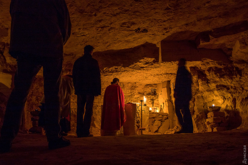 Облаченный в алую рясу священник практически в полной тишине совершает древний ритуал. Со стен на немногочисленных прихожан смотрят нарисованные древесным углем лики православных святых. Что-то такое, наверное, происходило в первые века от Рождества Христова в пещерах под Римом. Кстати, и в одесской истории был период, когда верующим приходилось спускаться под землю, чтобы не слышать и не видеть, как революционеры уничтожают их святыни.