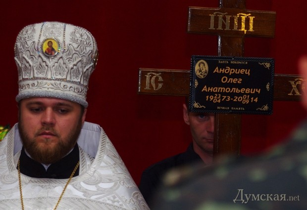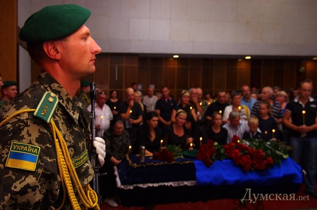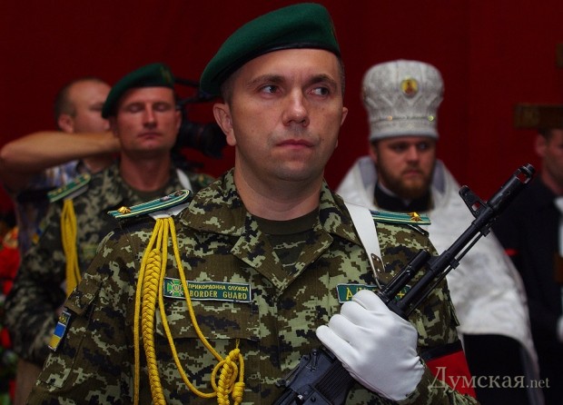 На территории Одесского погранотряда прощались с 41-летним майором-связистом ГПСУ Олегом Андрийцом, который пал 1 сентября в районе Новоазовска Донецкой области. Группа «зеленых беретов» на трех УАЗах выполняла боевое задание и напоролась на неприятеля.