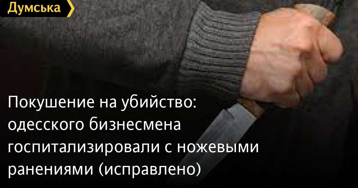 Замах на вбивство: одеського бізнесмена госпіталізували з ножовими пораненнями (виправлено)Чоловіка 1961 року народження з множинними колото-різаними ранами тулуба і шиї доправили в одну з приватних клінік Одеси після конфлікту, який стався днями на розі вулиць Леонтовича і Базарної. Як повідомили «Думській» в поліції, правоохоронці розпочали кримінальне провадження за частиною другою ст. 15, частиною першою ст. 115 КК України (замах на умисне вбивство) і вчора знайшли підозрюваного. Ним виявився одесит 1978 р.н., який зізнався у скоєному. Його помістили до ізолятору тимчасового тримання. Потерпілий Сергій С. - директор одеської компанії, яка спеціалізується на виробництві тротуарної плитки. Поліція, однак, не пов'язує те, що трапилося, з комерційною діяльністю пораненого. За версією слідства, між чоловіками спалахнув вуличний конфлікт, що переріс у бійку, під час якої опонент Сергія С. застосував ніж. «Правопорушник був п'яний і поводився не дуже адекватно. Потерпілий зробив йому зауваження. Слово за слово, і понеслося… Принаймні все вказує на те, що злочин не готувався», — наголосило наше джерело у правоохоронних органах. СМЕРТЬ РОСІЙСЬКИМ ОКУПАНТАМ! Помітили помилку? Виділяйте слова з помилкою та натискайте control-enter Новини по цій темі: 29 липня 2025: В Усатово Одеської області сталася перестрілка: поліція працює на місці (відео, оновлено) 28 липня 2025: П'яний на "Ягуарі" або гіпертонік? Звільнений топ-посадовець одеської поліції хоче повернутися на службу 19 червня 2025: Дівчинку, яку шукали сотні одеситів, знайшли вбитою: поліція працює з чоловіком, ймовірно причетним до загибелі 27 травня 2025: Увели гектар в університету: на Одещині засудили земельних аферистів, але без посадки і Хвоста |