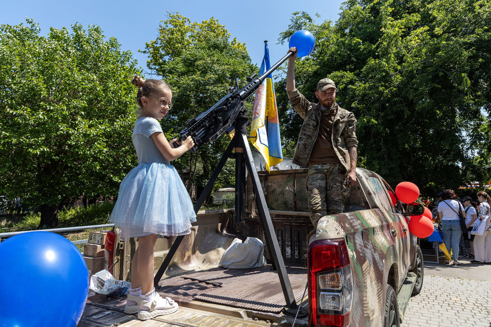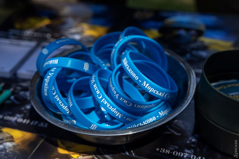 Неподалік від суворих морпіхів розмістилися «ловці шахедів» — пікап із важким кулеметом однієї з мобільних вогневих груп 122-ї окремої бригади територіальної оборони Збройних сил України. Будь-хто охочий міг сфотографуватися також із талісманом бригади — бойовим котом Шайбою.