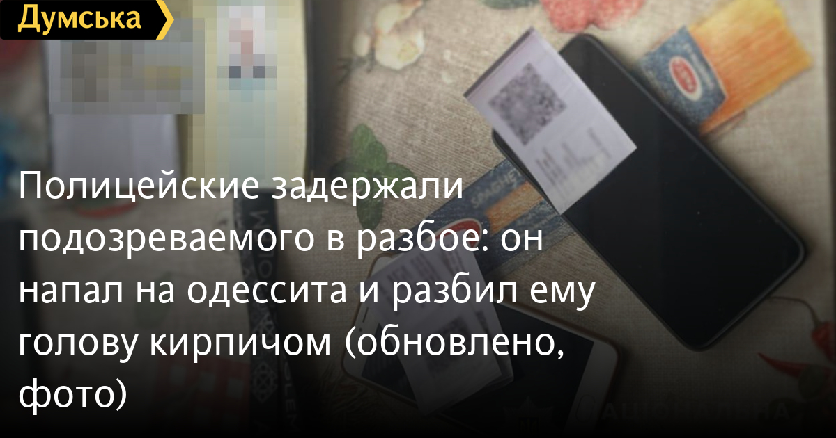 Полицейские задержали подозреваемого в разбое: он напал на одессита и разбил ему голову кирпичом (обновлено, фото)Правоохранители задержали 30-летнего подозреваемого в разбойном нападении на прохожего. Во дворе высотки на улице Краснова он отобрал у 36-летнего одессита сумку со смартфоном, ключами и документами от автомобиля, считает следствие. После злоумышленник бросился наутек, а увидев, что пострадавший догоняет его, нашел кирпич и разбил преследователю голову. Беднягу нашли прохожие, которые вызвали скорую и полицию. Беглеца в центре города задержали оперативники Одесского городского управления полиции. К тому времени он уже успел спрятать украденное, которое изъяли во время обыска. За совершение разбойного нападения, сопряженного с причинением тяжких телесных повреждений, фигуранту объявили подозрение по ч.4 ст.187 Уголовного кодекса Украины. Ему грозит лишение свободы на срок до пятнадцати лет с конфискацией имущества. До избрания меры пресечения его поместили в изолятор временного содержания. ОБНОВЛЕНО В 15:48. Как сообщили «Думской» в полиции, у пострадавшего диагностировали открытую черепно-мозговую травму, ушиб мозга, кровоизлияние в теменной области, перелом свода и основания черепа. Мужчину госпитализировали. По данным следствия, мужчины были знакомы. Пострадавшего с проломленной головой нашли в подьезде дома на Краснова, 7А. СМЕРТЬ РОССИЙСКИМ ОККУПАНТАМ! Заметили ошибку? Выделяйте слова с ошибкой и нажимайте control-enter |