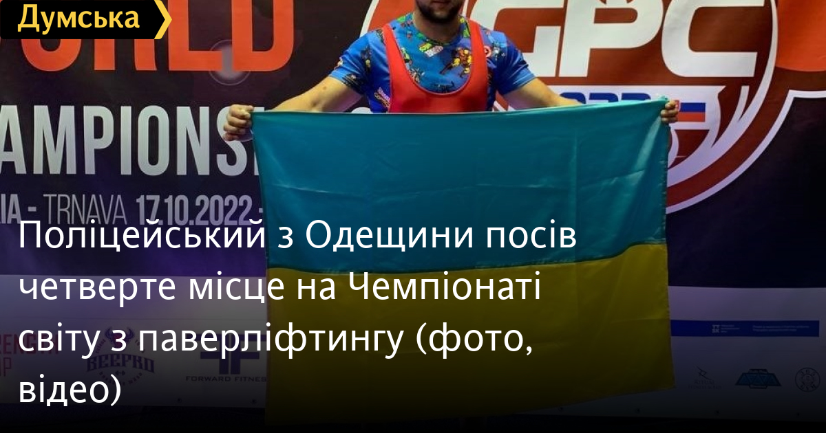 Поліцейський з Одещини посів четверте місце на Чемпіонаті світу з паверліфтингу (фото, відео)Четверте місце на Чемпіонаті світу з паверліфтингу посів поліцейський з Овідіополя Євгеній Боговик. Змагання проходили в місті Трнава, що в Словаччині, за участю близько семи тисяч спортсменів з різних країн, повідомили в обласному главку. Євгеній виступив у дисципліні з жиму лежачи в категорії до 90 кілограмів і показав гідний результат, пожавши штангу вагою 190 кг. У турнірній таблиці, в якій були представлені здобутки 12 країн, старший сержант посів четверте місце. Зізнається: подужав те, що мав, але планував більше, тому прагне надолужити на Чемпіонаті світу, який проходитиме у 2023 році в Угорщині. «Під час нагородження, коли я ніс прапор України, мене переповнювали почуття гордості за свою державу та власної гідності. Навколо панувало відчуття підтримки з боку спортсменів з інших країн», — розповів старший сержант поліції. Паверліфтингом Євгеній захоплювався з 16 років. Він майстер спорту міжнародного класу, десятикратний чемпіон України з паверліфтингу в жимі лежачи. У 2020 році став чемпіоном Європи у ваговій категорії до 100 кг, у 2021 році здобув 5 місце на чемпіонаті світу в Польщі у тій же ваговій категорії. СМЕРТЬ РОСІЙСЬКИМ ОКУПАНТАМ! Помітили помилку? Виділяйте слова з помилкою та натискайте control-enter Новини по цій темі: 29 липня 2025: В Усатово Одеської області сталася перестрілка: поліція працює на місці (відео, оновлено) 28 липня 2025: П'яний на "Ягуарі" або гіпертонік? Звільнений топ-посадовець одеської поліції хоче повернутися на службу 19 червня 2025: Дівчинку, яку шукали сотні одеситів, знайшли вбитою: поліція працює з чоловіком, ймовірно причетним до загибелі 27 травня 2025: Увели гектар в університету: на Одещині засудили земельних аферистів, але без посадки і Хвоста |