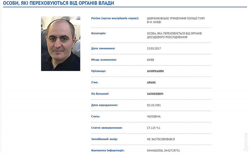Амирханян находится в розыске с 23 марта 2017 года. Его подозревают в преступлении, предусмотренном частью 1 ст. 125 УК Украины — «умышленное нанесение легких телесных повреждений»: в 2015 году предприниматель напал на руководителя «Укравтодора» Андрея Батищева.