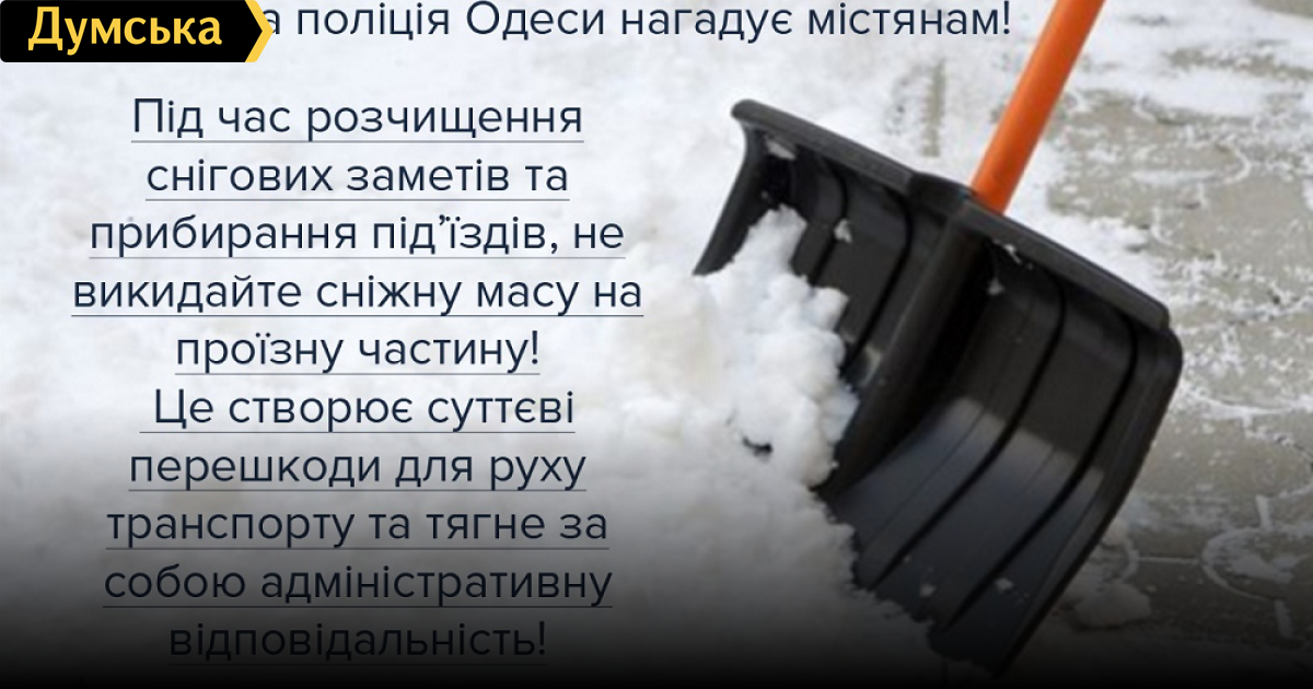 Одесская полиция обратилась гражданам с просьбой не выбрасывать снег после расчистки на проезжую часть, поскольку это затрудняет движение транспорта.