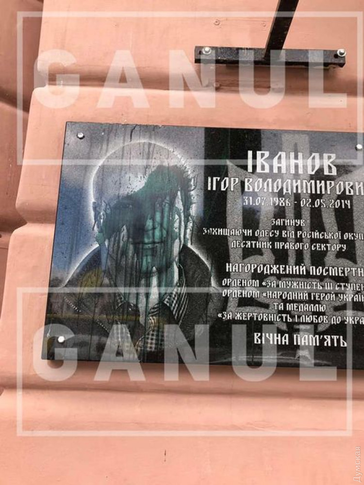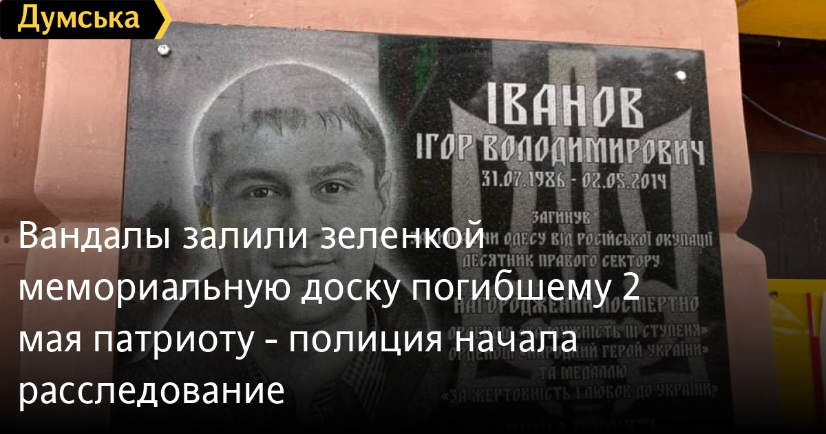 Вандалы залили зеленкой мемориальную доску погибшему 2 мая патриоту — полиция начала расследованиеПолиция расследует акт вандализма над памятной доской в центре Одессы. Сообщение о том, что на Преображенской улице неизвестные облили зеленкой табличку, установленную на доме в том месте, где 2 мая 2014 года украинский активист и патриот Игорь Иванов, поступил утром 2 сентября. Как сообщили в пресс-службе Нацполиции Одесской области, сведения по данному факту зарегистрированы в установленном законом порядке. Обстоятельства происшествия и причастные к нему лица устанавливаются. Между тем активисты уже очистили мемориальную доску от зеленки. Фото Демьяна Ганула СМЕРТЬ РОСІЙСЬКИМ ОКУПАНТАМ! Помітили помилку? Виділяйте слова з помилкою та натискайте control-enter