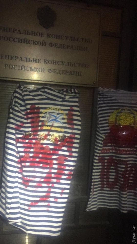 ОБНОВЛЕНО. Патриоты повесили на ворота консульства запятнанные красной краской тельняшки — намек на кровь, которую пролили сегодня украинские моряки.