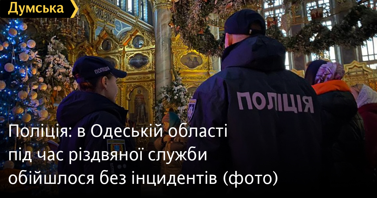 Поліція: в Одеській області під час різдвяної служби обійшлося без інцидентівБільше тисячі правоохоронців стежили за громадським порядком і дотриманням норм воєнного часу під час різдвяних богослужінь в Одеській області. У ГУНП повідомили, що на святкову службу до храмів прийшли до 19 тисяч жителів регіону. Різдво проходить без порушень громадського порядку. «Мешканці Одеси та області з розумінням і відповідальністю поставилися до ситуації, що склалася в країні, та обмежень воєнного стану, за що ми їм дуже вдячні», — зазначили поліцейські. Помітили помилку? Виділяйте слова з помилкою та натискайте control-enter Новини по цій темі: 29 липня 2025: В Усатово Одеської області сталася перестрілка: поліція працює на місці (відео, оновлено) 28 липня 2025: П'яний на "Ягуарі" або гіпертонік? Звільнений топ-посадовець одеської поліції хоче повернутися на службу 19 червня 2025: Дівчинку, яку шукали сотні одеситів, знайшли вбитою: поліція працює з чоловіком, ймовірно причетним до загибелі 27 травня 2025: Увели гектар в університету: на Одещині засудили земельних аферистів, але без посадки і Хвоста |