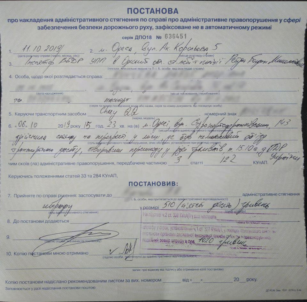В постановлении указано, что за правонарушение, предусмотренное статьей 122 КУоАП, водителя оштрафовали на 510 гривен.