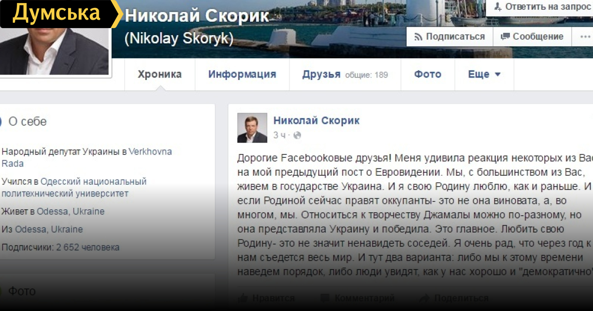 Об этом член парламента (оккупационного, видимо) написал на своей странице в Фейсбуке, комментируя победу украинки на Евровидении.