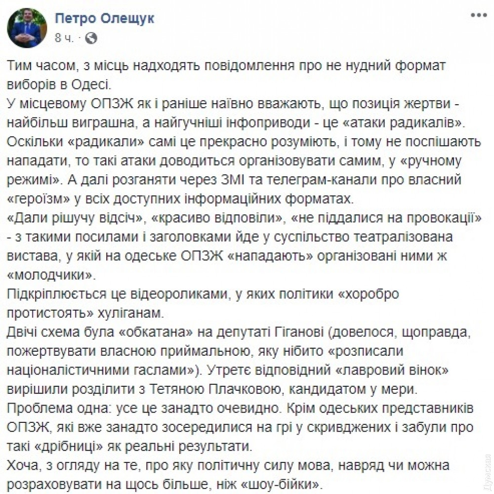 «Поскольку «радикалы» сами это прекрасно понимают и не спешат нападать, такие атаки приходится организовывать самим, в «ручном режиме». А затем разгонять через СМИ и телеграм-каналы о собственном героизме у всех доступных информационных форматах. «Дали решительный отпор», «красиво ответили», «не поддались на провокации» — с такими посылами и заголовками идет в общество театрализованный спектакль, в котором на одесское ОПЗЖ «нападают» организованные ими же «молодчики». Подкрепляется это видеороликами, в которых политики «храбро противостоят» хулиганам», — отметил Петр Олещук.