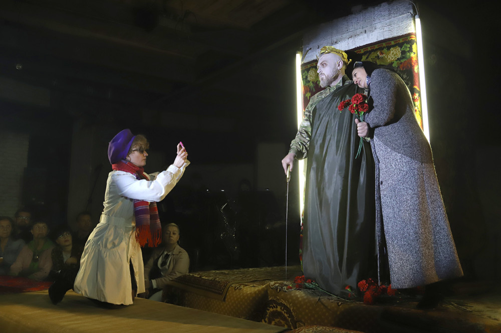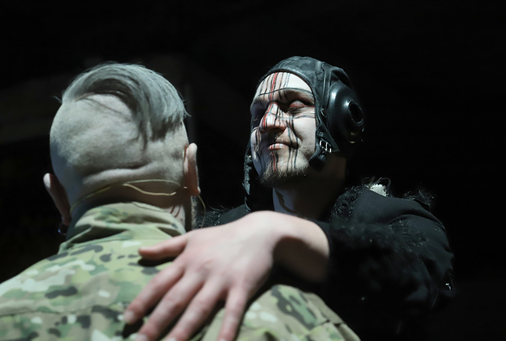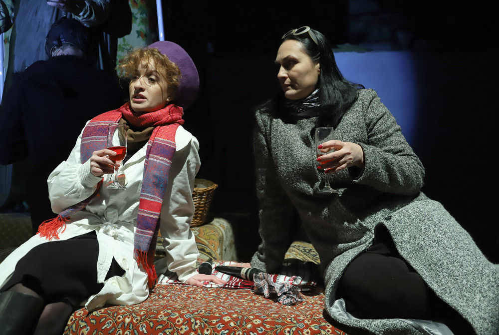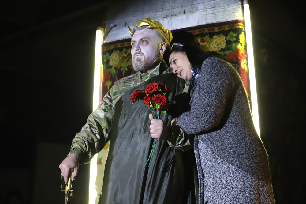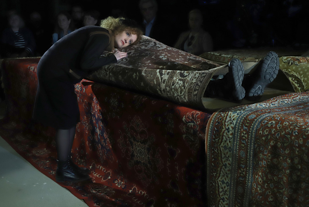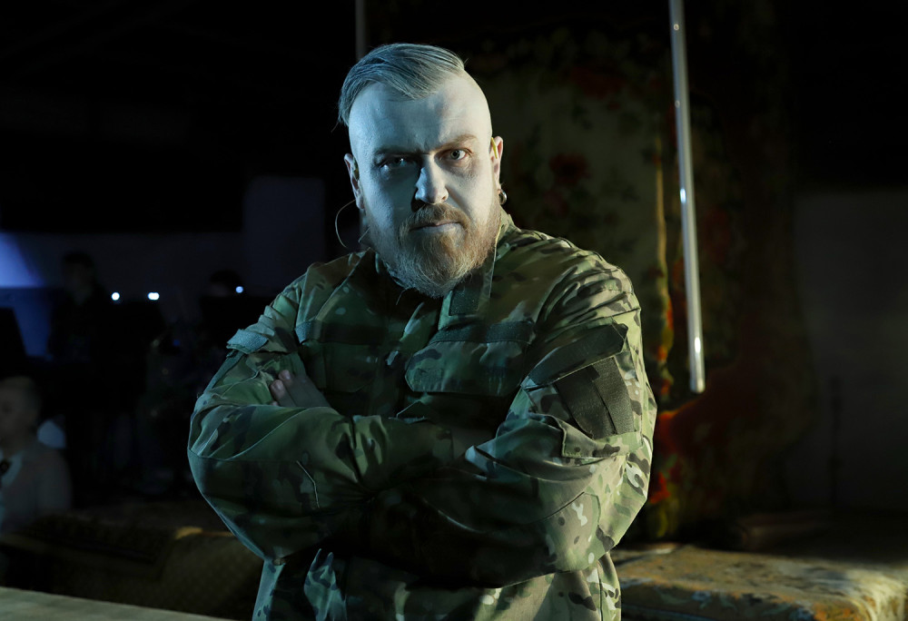 Как только театр снова начнет продавать билеты, зрители смогут на час погрузиться не в беспросветный мрак, а в фантасмагорию, не лишенную юмора, порой черного. Такова жизнь, такова смерть. Отличнейшая новость: гроб, который мы видели на репетиции среди реквизита, упразднен, ложиться в него исполнителю главной роли не надо. Сценограф Юлия Зауличная вместо гроба использовала ковер, в который завернут в ожидании собственных похорон полковник Саша (Александр Самусенко). Витальная энергия артиста бьет ключом, в какой-то момент начинаешь верить, что рвется военный защитить родину даже с того света и печалится – сил все же нет, руки не держат…