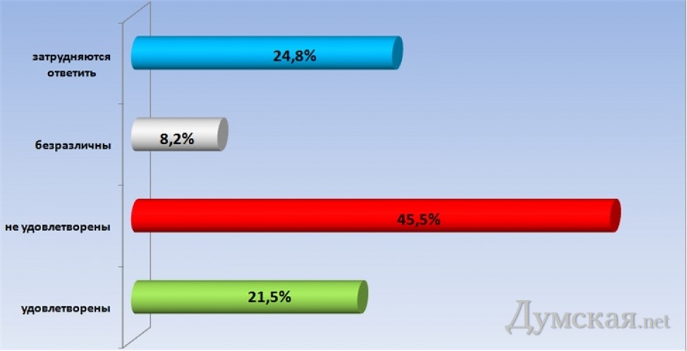Половина избирателей Одессы недовольна работой Костусева, еще треть не определиласьПочти половина избирателей Одессы не удовлетворены работой нынешнего мэра города Алексея Костусева. Об этом в ходе пресс-конференции сообщил глава Одесской областной организации Комитета избирателей Украины Анатолий Бойко. По его словам, такие данные показал опрос горожан, проведенный КИУ среди 1047 одесситов, которые имеют право голоса. Теоретическая ошибка выборки – не более 3,03%. Так, работу мэра на посту признали неудовлетворительной 45,5% избирателей, 24,8% затруднились оценить работу городского головы, и лишь 21,5% довольны тем, как Костусев выполняет свои обязанности. Еще 8,2% избирателей вообще не интересуются работой мэра. При этом работой городского совета избиратели недовольны еще больше — 48,1%, треть опрошенных не были готовы оценивать работу депутатов, и лишь 15,6% избирателей довольны своими избранниками. Остальным 7,3% — все равно. СМЕРТЬ РОСІЙСЬКИМ ОКУПАНТАМ! Помітили помилку? Виділяйте слова з помилкою та натискайте control-enter |