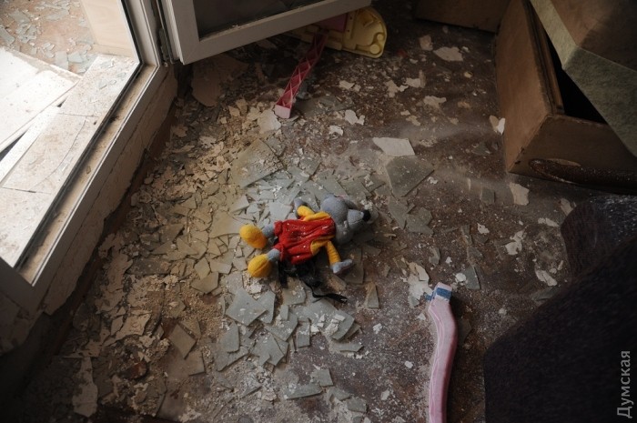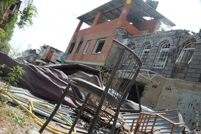 Под ногой противно хрустит битое стекло. Улица завалена рваным железом, кирпичами и вырванной с мясом из стен домов арматурой. Во многих разбитых домах на полу валяются детские игрушки и коляски, в кухнях на плитах стоят забытые сковородки и кастрюли.