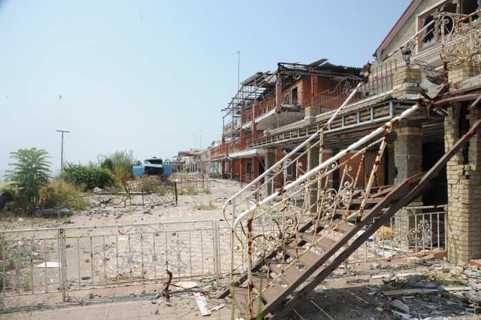 Это – курортный поселок Широкино. Когда-то иметь дачку в здешних краях считалось высшим шиком среднего класса Донецка: на лето многие дончане переезжали жить под «Марик» (Мариуполь) на целое лето. Курени и дачки были вторым домом, на их отделку денег не жалели. В одном из домиков даже есть подъемник на второй этаж для инвалида – аккуратное сиденье с моторчиком, вмонтированное в лестницу. Все это теперь разбито, размолото жестокими молотами войны – снарядами и минами.