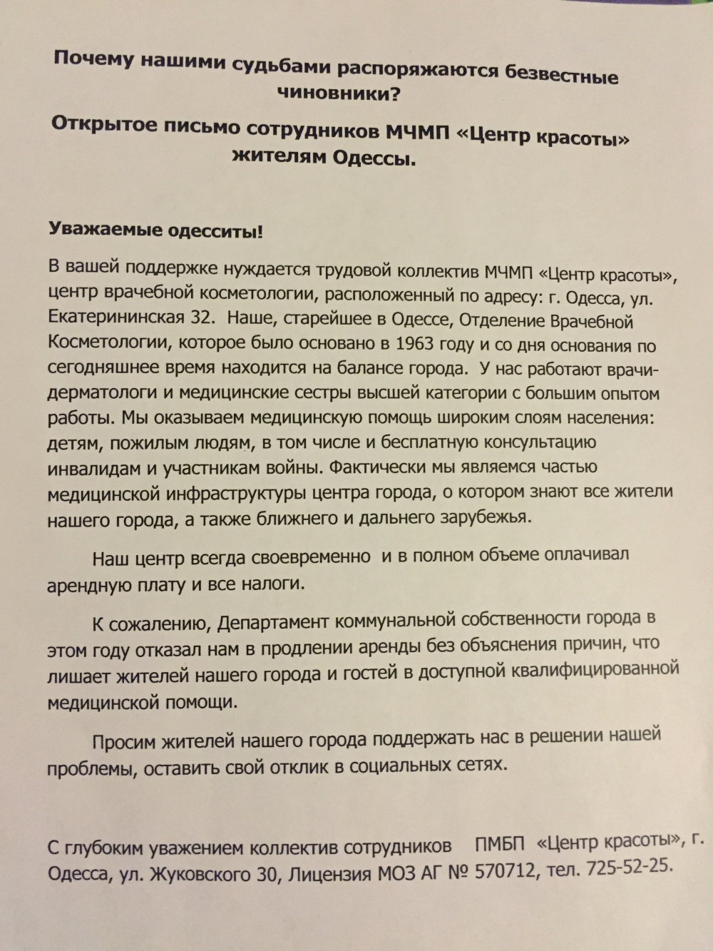 Косметологический центр, в котором работают дипломированные врачи и медсестры, был основан в середине 1963 года, когда СССР правил Хрущев, а в США еще не убили Кеннеди, и с тех пор никуда не переезжал. Но недавно муниципальный департамент коммунальной собственности отказался продлевать «Центру красоты» договор аренды. Врачей о причинах такого решения в известность не поставили. Чиновники настаивают на выселении клиники в двухнедельный срок.