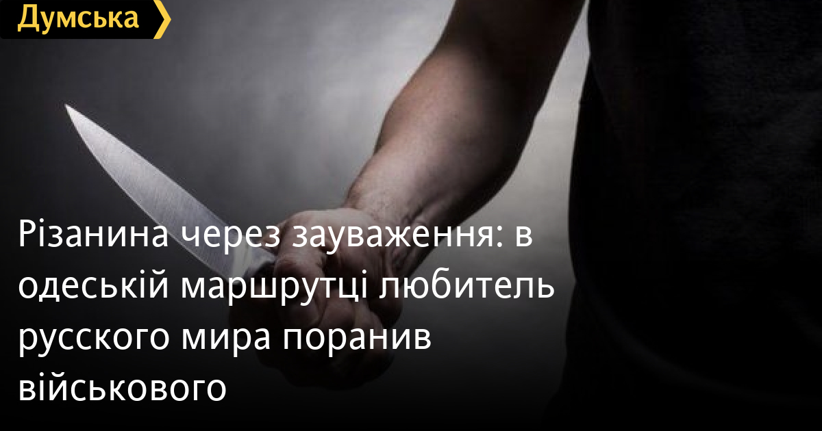 Різанина через зауваження: в одеській маршрутці любитель «русского мира» поранив військовогоКонфлікт в одеській маршрутці призвів до різанини, внаслідок якої постраждав військовослужбовець. Судячи з відео, яке облетіло одеські Телеграм-канали, у 232-му автобусі невідомий вихваляв країну-агресора і кричав «Слава росії». Коли військовий зробив йому зауваження і запитав: «Чого ти тут знаходишся», неадекват у відповідь заявив: «А чого ти тут знаходишся, ти ж б ть захисник Батьківщини». Після цього, за даними пабліків, любитель росії накинувся на військового, залив усю маршрутку газовим балончиком, а коли всі вийшли на вулицю, вдарив опонента ножем. У пресслужбі поліції Одеської області «Думській» підтвердили інформацію про інцидент, не уточнивши причину. Там заявили, що невідомий завдав ножового поранення 55-річному чоловікові. Постраждалого госпіталізували у важкому стані. Нападника затримали на місці. Йому готуються повідомити про підозру в нанесенні тяжких тілесних ушкоджень. Помітили помилку? Виділяйте слова з помилкою та натискайте control-enter |