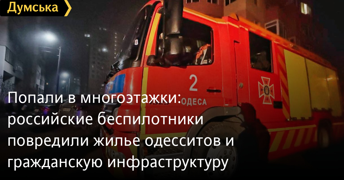 Влучили у багатоповерхівки: російські безпілотники пошкодили житло одеситів і цивільну інфраструктуруВлучання в житлові будинки та об'єкти цивільної інфраструктури зафіксовано в Одесі в результаті російської атаки. Як повідомив голова міської військової адміністрації Сергій Лисак, попередньо обійшлося без потерпілих. На місцях працюють оперативні штаби та екстрені служби. Фахівці проводять обстеження територій та оцінку завданих збитків. За даними «Думської», йдеться щонайменше про дві багатоповерхівки. Одна з них розташована на Люстдорфській дорозі. Друга — на Педагогічній. СМЕРТЬ РОСІЙСЬКИМ ОКУПАНТАМ! Помітили помилку? Виділяйте слова з помилкою та натискайте control-enter |