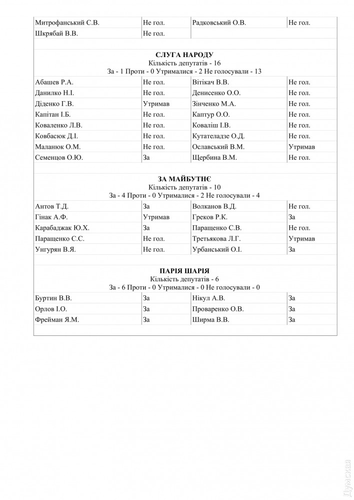 Во фракции «За майбутнє» голоса разделились: четверо за, двое воздержались, четверо не голосовали (двоих не было физически). С «шарийцами» солидарны Юрий Карабаджак (фермер из бывшего Арцизского района), Трифон Антов, Руслан Греков и экс-нардеп Александр Урбанский.