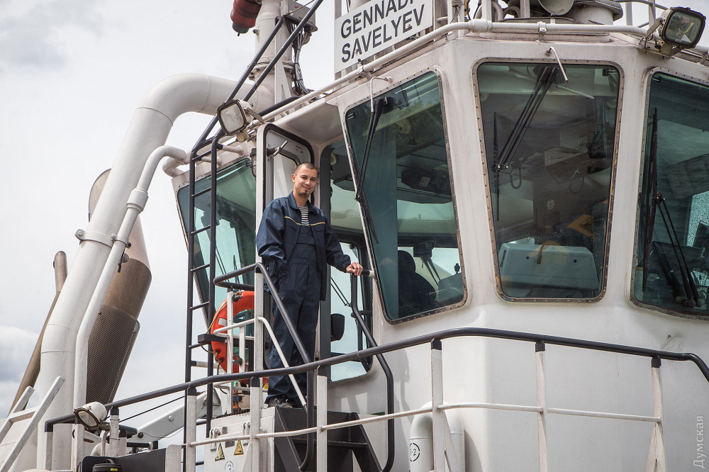 Мы познакомились с экипажем «Савельева». Капитан Юрий Великохатько трудится в порту уже 35 лет. Рассказывает, что работа на буксире всегда сопряжена с риском: «Бывают разные режимы, и часто ты идешь практически на умышленное столкновение с судном. При этом нужно умудриться не разбить ни это судно, ни буксир», — говорит он.