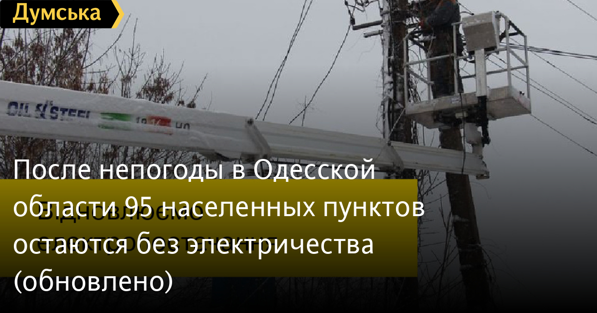 После непогоды в Одесской области 95 населенных пунктов остаются без электричества (обновлено)По состоянию на 9 утра в Одесской области после вчерашнего снега и гололедицы обесточены 95 населенных пунктов (12 из них – частично). В ДТЕК «Одесские электросети» сообщили, что за прошлые сутки их ремонтным бригадам удалось восстановить электроснабжение в 74 селах. Работы продолжаются. Сейчас в регионе задействованы 31 выездные ремонтные бригады электриков (71 специалист и 42 машины). Отметим, в сводке ГСЧС за вчерашний день указано, что спасатели в 14:33 помогли вытащить ремонтную машину электросетей, которая застряла в Беляевке на бездорожье. ОБНОВЛЕНО В 12:28. В ДТЭК сообщили, что по состоянию на 12:00 без света остаются 86 населенных пунктов в области, 6 из них - частично. ОБНОВЛЕНО В 17:06. Ремонтные бригады восстановили электроснабжение еще в 39 населенных пунктах. Без света остаются жители 47 населенных пунктов (8 обесточены частично). Ремонтные работы продолжаются. СМЕРТЬ РОССИЙСКИМ ОККУПАНТАМ! Заметили ошибку? Выделяйте слова с ошибкой и нажимайте control-enter |