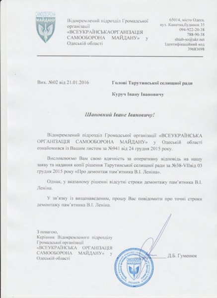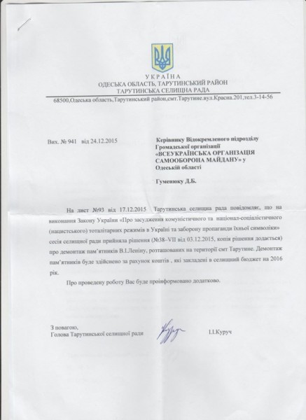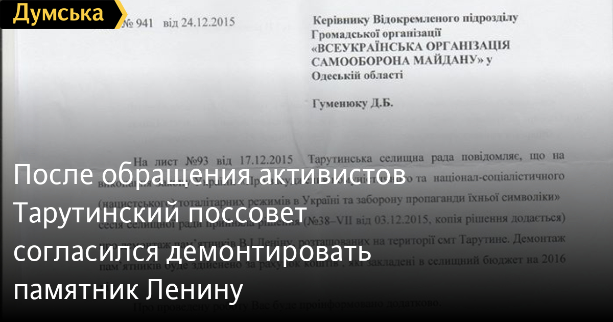 «Получив от жителей Тарутино информацию о невыполнении местными властями действий по демонтажу памятника, руководство «Самообороны» обратилось к председателю поселкового совета Ивану Куручу с просьбой посодействовать решению данного вопроса. Недавно в адрес организации пришел ответ, в котором господин председатель сообщает, что Тарутинский поселковый совет принял решение удовлетворить просьбу активистов и демонтировать памятник за счет средств поселкового бюджета», — говорится в сообщении.