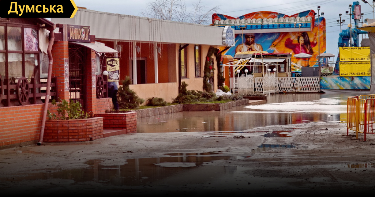 Песок после затопления больше похож на слежавшуюся мокрую глину, от которой несет тухлятиной. Огромные лужи остались между аттракционами и различными летними площадками увеселительно-общепитовских заведений. В районе бывших касс прогулочных катеров ощутимо чувствуется запах газа. Следы затопления видны даже на рельсах трамвайного кольца — а это буквально в десятке метров от Николаевской дороги, сразу за которой — жилые дома.