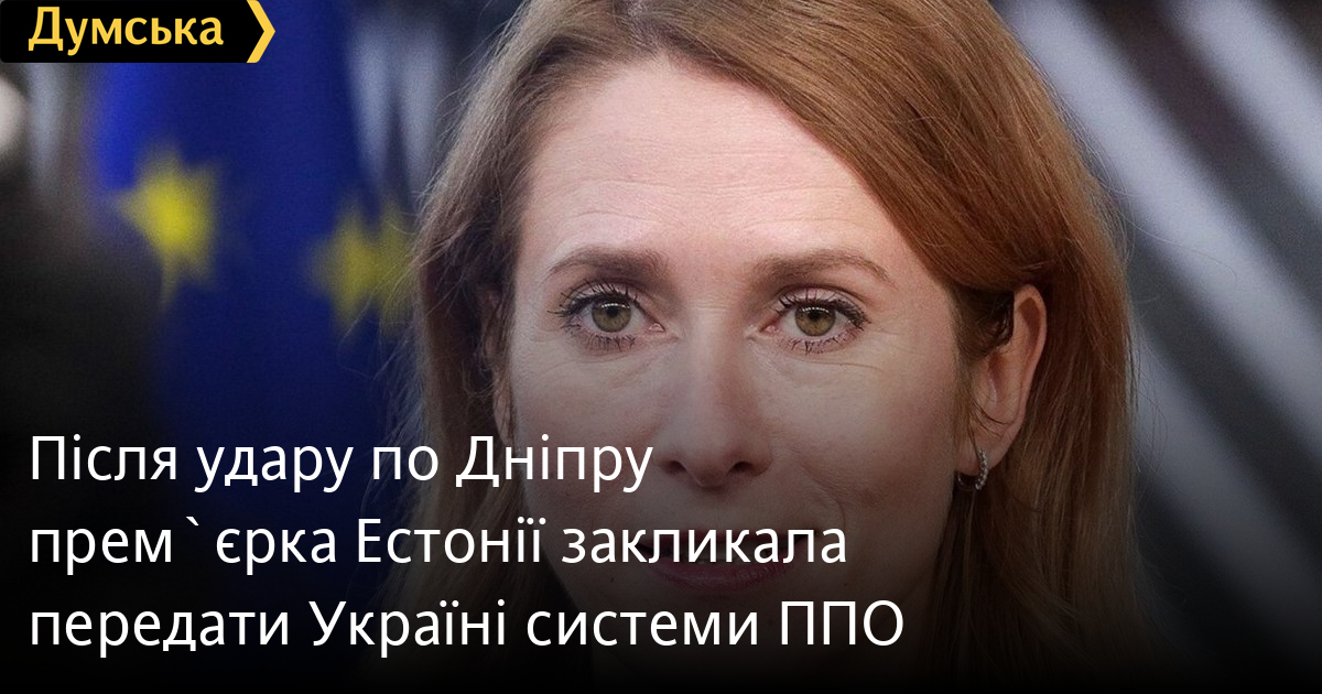 Після удару по Дніпру прем`єрка Естонії закликала передати Україні системи ППОПередати Україні танки і системи протиповітряної оборони закликала партнерів та союзників прем'єр-міністр Естонії Кая Каллас після ракетного удару по Дніпру. Про це вона написала у твіттері. «Атаками на Дніпро та інші міста України росія вкотре довела, що вона є терористичною державою. Мій заклик до союзників і партнерів: давайте посилимо нашу підтримку. Україні потрібна зброя, зокрема танки і засоби протиповітряної оборони. Росія має бути притягнута до відповідальності за всі скоєні злочини», — підкреслила Каллас.