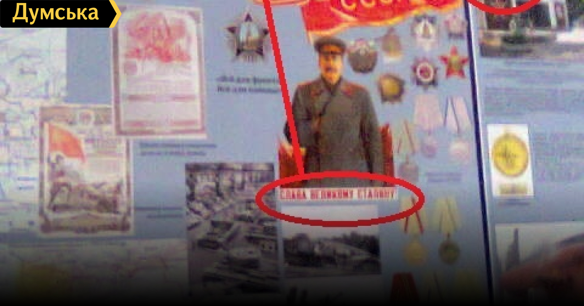 Так можно и историю Великой отечественной войны забыть. Прежний стенд нужно вернуть, а надпись «Слава великому Сталину» заменить на «Председатель Государственного комитета обороны 1941-1945 г.г.»
