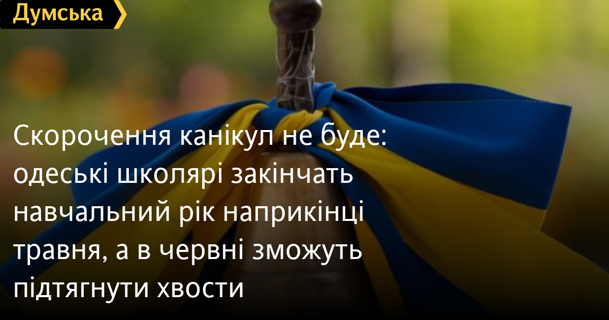 Скорочення канікул не буде: одеські школярі закінчать навчальний рік наприкінці травня, а в червні зможуть підтягнути хвостиНавчальний рік в одеських школах офіційно завершиться 30 червня, проте діти підуть на канікули місяцем раніше. Про це повідомила директорка департаменту освіти і науки міськради Олена Буйневич, коментуючи постанову Кабміну, яка викликала великий резонанс серед школярів та їхніх батьків. Днями у ЗМІ з'явилася новина про те, що в українських дітей вкрали місяць канікул і їм доведеться вчитися до кінця червня. Посилалися журналісти при цьому на постанову Кабінету міністрів. Ми звернулися по роз'яснення до Олени Буйневич, яка пояснила, що таке непорозуміння виникає регулярно, і поспішила заспокоїти школярів та їхніх батьків. «Це повторюється практично щороку, журналісти бачать дату 30 червня і роблять новину про те, що ми відпочиваємо лише два місяці. У реальності діти підуть на канікули наприкінці травня, оскільки, незважаючи на всі проблеми, що були протягом року, ми встигаємо пройти програму. Що ж стосується червня, то цей місяць дається для закриття хвостів, різних консультацій та індивідуальних занять», — пояснила вона. Помітили помилку? Виділяйте слова з помилкою та натискайте control-enter |