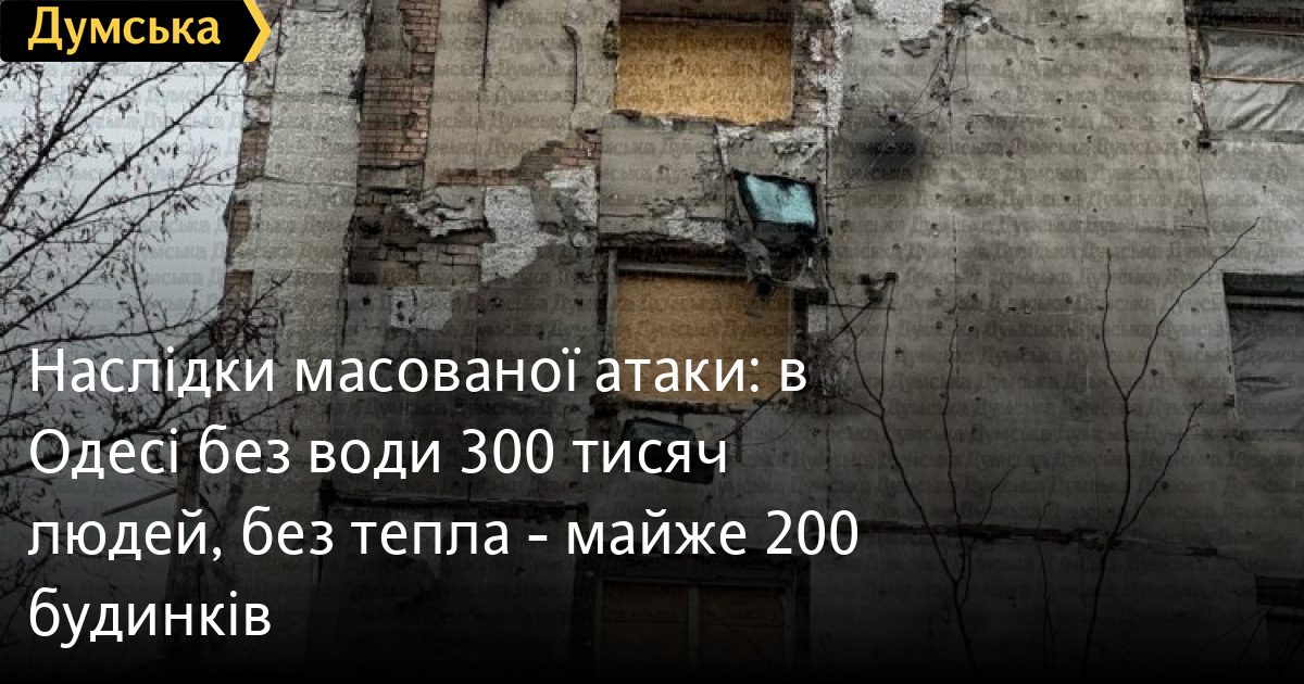 Наслідки масованої атаки: в Одесі без води 300 тисяч людей, без тепла — майже 200 будинківБлизько 300 тисяч людей в Одесі залишилися без водопостачання через відключення електроенергії в результаті нічної атаки. Як повідомив віцепрем'єр-міністр Олексій Кулеба, без тепла залишилися майже 200 будинків. «Тривають роботи по запуску систем, де можливо — залучаються резервні джерела живлення», — заявив Кулеба. Він додав, що ворог вночі цілеспрямовано бив по цивільній та енергетичній інфраструктурі не тільки Одеси, а й Києва, Дніпра, Сумської та інших областей «На місцях працюють енергетики, рятувальники, комунальні служби. Робимо все можливе, щоб якомога швидше повернути людям тепло і воду», — підкреслив віцепрем'єр-міністр. Нагадаємо, в результаті удару по Одесі постраждав 58-річний чоловік, пошкоджено ринок «Черемушки», супермаркет, житловий будинок і десятки авто. Без світла, води та опалення залишилися мешканці Київського та Хаджибейського районів. СМЕРТЬ РОСІЙСЬКИМ ОКУПАНТАМ! Помітили помилку? Виділяйте слова з помилкою та натискайте control-enter |